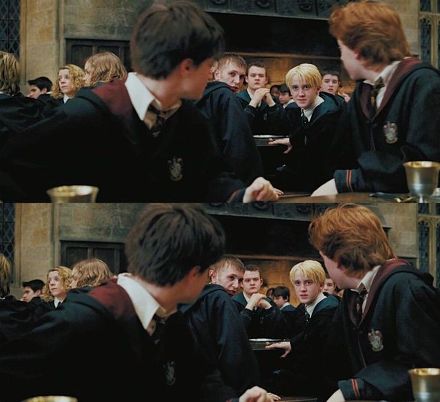 赫敏大喊,罗恩挡在哈利和马尔福之间——哈利的魔杖直直地指着马尔福的鼻子,马尔福身后站着大块头高尔和克拉布。