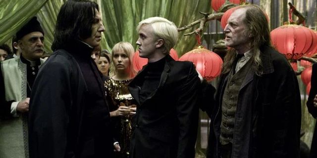 两位男人站在这个女人的身边。一个是手握权杖但是满脸忧虑的卢修斯,另一个是披着乌黑头发的斯内普。