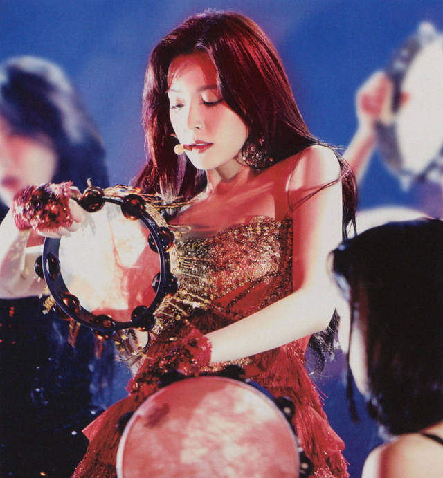金色珠光亮片的抹胸长裙,精致娇媚,石榴红的头发连发丝都耀眼夺目,从头到脚都是人群中最特别的,刺眼的却让人挪不开眼睛,像是荆棘的玫瑰。