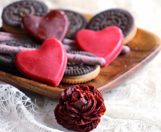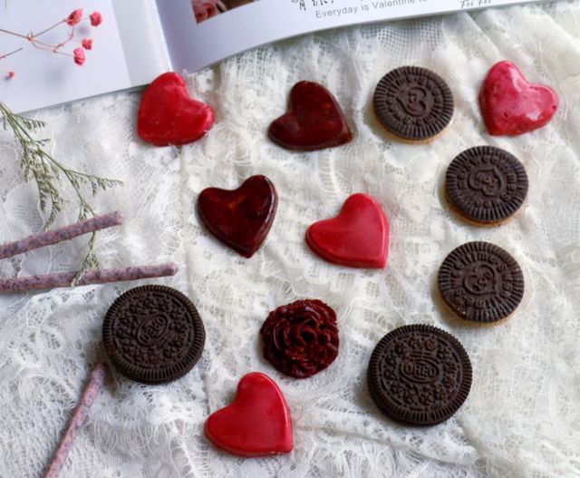 芷叶欢调好的巧克力淋入心型模具中。抹平、抖几下、防止有空洞。然后放入玫瑰花模具中、