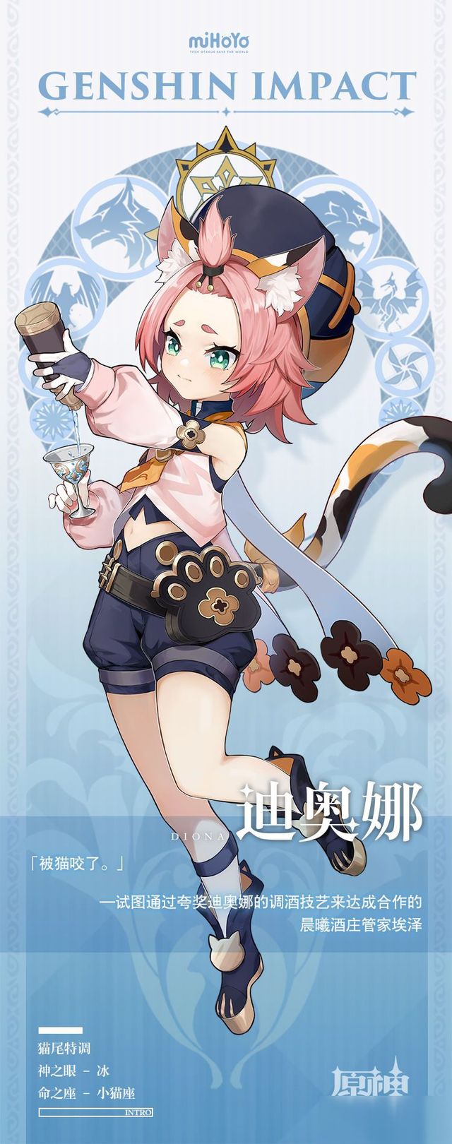 张真源在清泉镇差不多已经修理完了,他再来之前特意去查了清泉镇的资料。镇子里的人世世代代都是以打猎为生,许多人都是猎户。迪奥娜就是其中一个猎户的小女儿。迪奥娜是凯茨莱茵家族中获得冰系神之眼的小女孩,凯茨莱茵家族的特征就是猫耳和猫尾,这使一米二的小迪奥娜变得更加可爱。不过和凯茨莱茵家族的其他人不同,迪奥娜不喜欢酒,为了调出最难喝的酒搞垮酒业,她特意去了蒙德城的猫尾酒馆当调酒师。可偏偏她是个一定会调出好酒的体质。