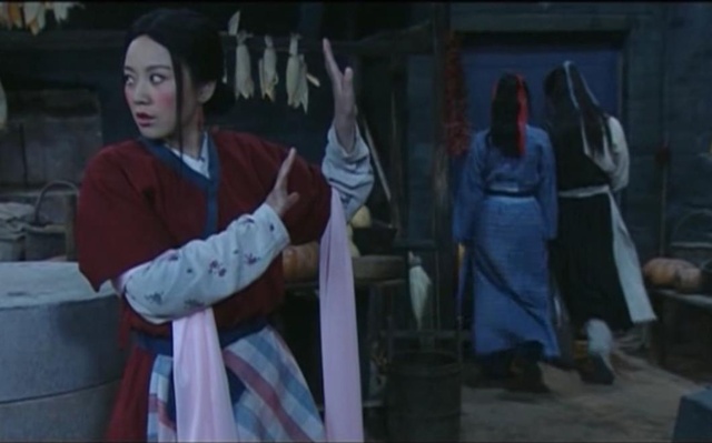 佟湘玉忙乱转身之际,红绫出手如电,右手两指已戳中她的后背,随着一声“葵花点穴手”,佟湘玉以一副滑稽的模样定在原地——双手翘起,手指挽了个兰花,像是行了个礼。