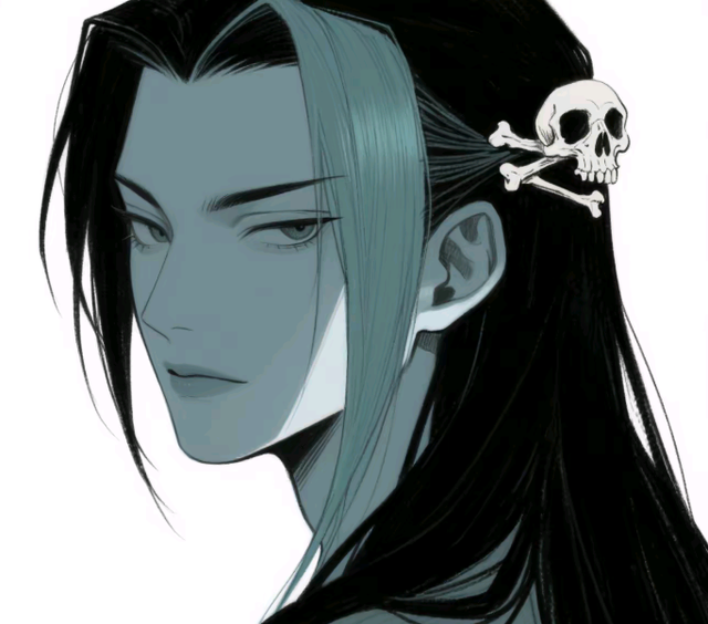 手上的死神镰刀化为一缕烟雾,向他身体周围蔓延开来。随着青灰色长袍缓缓散落,他真正的面容才逐渐展露——如瀑布般的黑色长发被骷髅头状发饰收拢在脑后,右侧一缕竟呈现青灰色。他面庞如刀削般冷峻,青灰色皮肤毫无瑕疵,剑眉星目间散发凛冽气势。