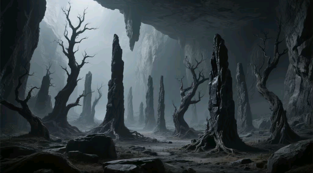 然而,这片空间并不单调,它宛若一片错综复杂的石窟林海,随处可见拔地而起的黑色岩石柱,形如枯槁的古木,扭曲、冷硬,透着一股难以言喻的荒凉与肃杀之气。