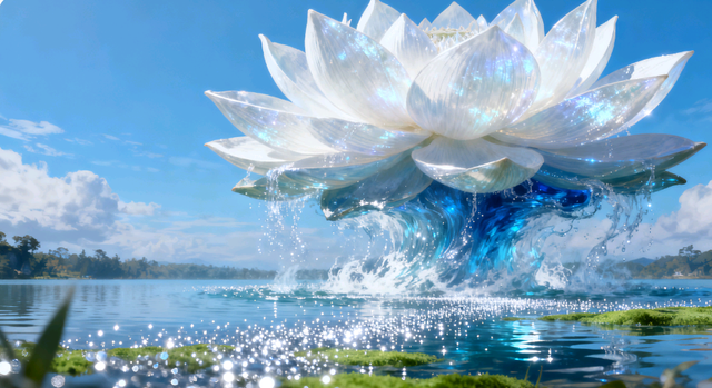 原本灰暗的天空,随着时间流转渐渐染上澄澈的湛蓝;下方清澈的湖面也泛起一层粼粼银光,无数银白色的细密光点从湖面袅袅升起,落地的刹那便晕开一片翠茵。深蓝中带着莹白的湖水在空中汇聚,凝出一朵硕大的双层莲花,花瓣缓缓舒展的缝隙里,泄出缕缕白玉色的流光。银白色光点如轻纱漫舞,江月隐约望见一道熟悉的少女身影。直到光点渐渐散去,莲花中央先伸出一只宛如去皮藕节般的纤纤玉手,紧接着,少女的整个身子悄然探了出来,那道身影才愈发清晰。