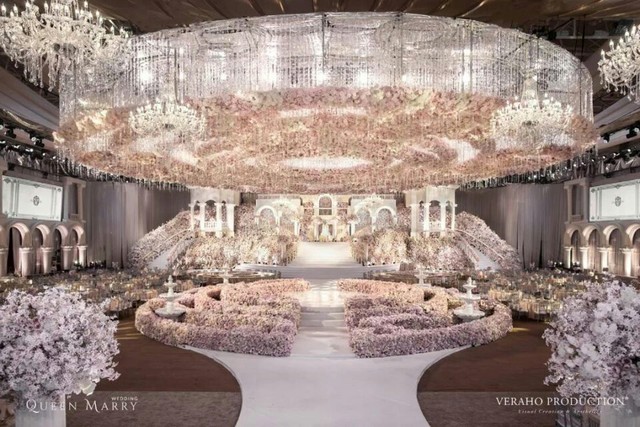 历时七个半月,总花费超千万,宴请×××××宾客,2×××工作人员作业,超××吨鲜花打造的梦幻宫殿。这真是一场一眼看到,就仿若梦如仙境的既视感。整场婚宴占地8000平,分成户外的庄园和室内的宴会,两者彼此连通,造就了一个大型的美到不可方物的童话婚礼现场。