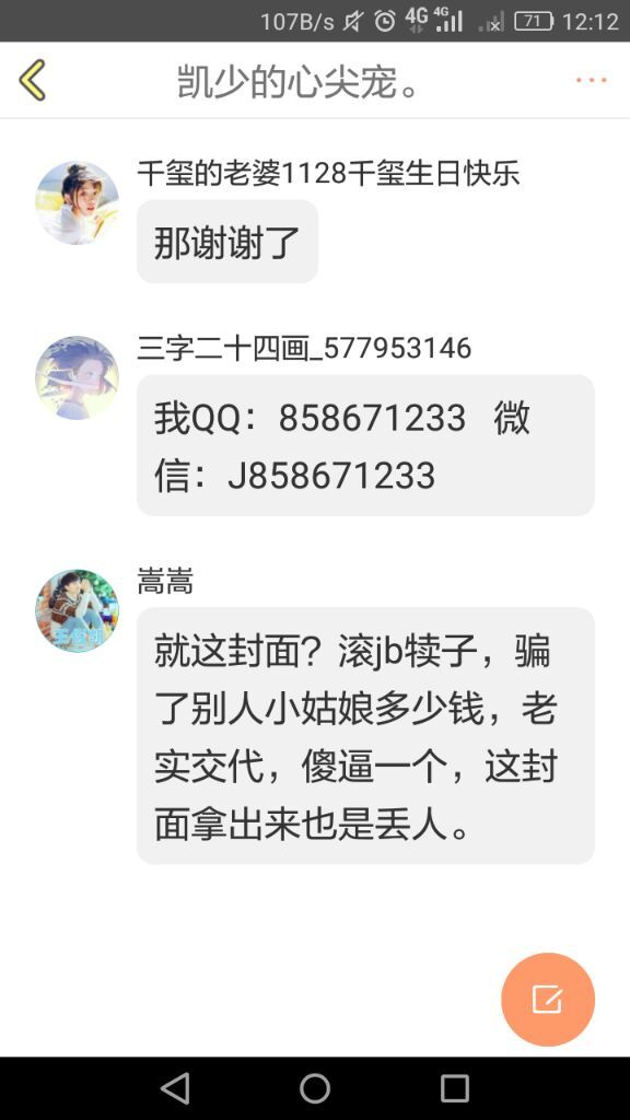 真不知道你的书读到哪里去了,什么叫骗,你知道骗是什么吗?我帮她们做封面,她们付钱,我做图,她们都没说不好看,还说下次要做再找我,你瞎哔哔什么!你凭什么一口否定别人的劳动成果?你说我是骗,我收了钱给别人发做好的封面,这是等价交换,是交易。说我做的封面难看都丢人,请问是帮你做要你钱了还是怎样?