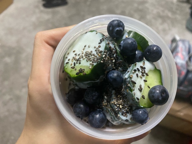 作者自己做的酸奶燕麦杯,有黄瓜,蓝莓,红枣片,芝麻,奇亚籽