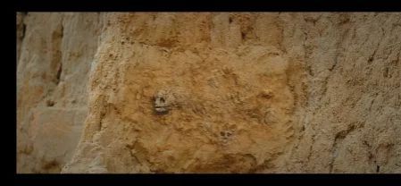 第二天一早,我们在魔鬼城里继续走着,走了段时间发现了一面特别的岩壁,大家说着,胖子拿出匕首刮开了岩壁表面上的泥土,是化石。