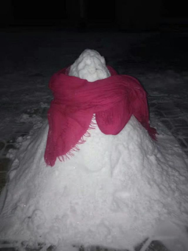 后来看了看照片,这雪人实在像一个雪堆,如果不是围巾衬托着,谁都很难想出来这是一个雪人。