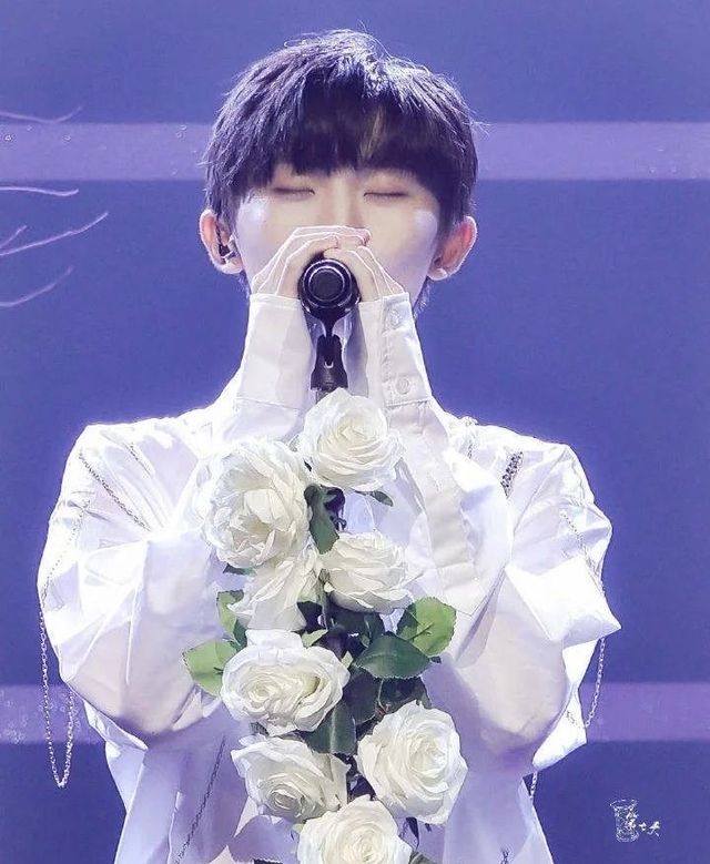 手握白色玫瑰缠绕的话筒,淡紫色的灯光照射在他的身上,真的是好干净的一个男孩子。