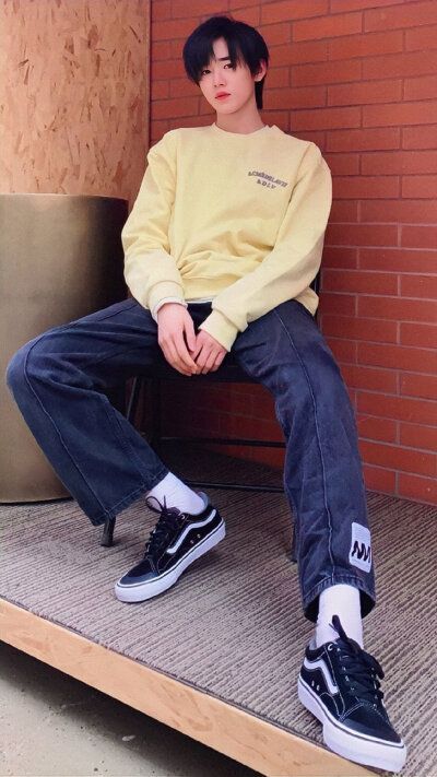 宋亚轩穿着黄色卫衣和黑色宽松裤下来了