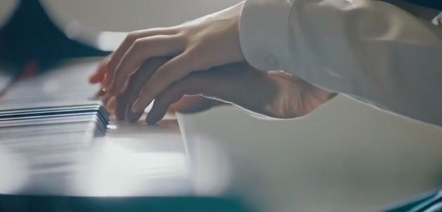 她抬起右手放在钢琴上示意.