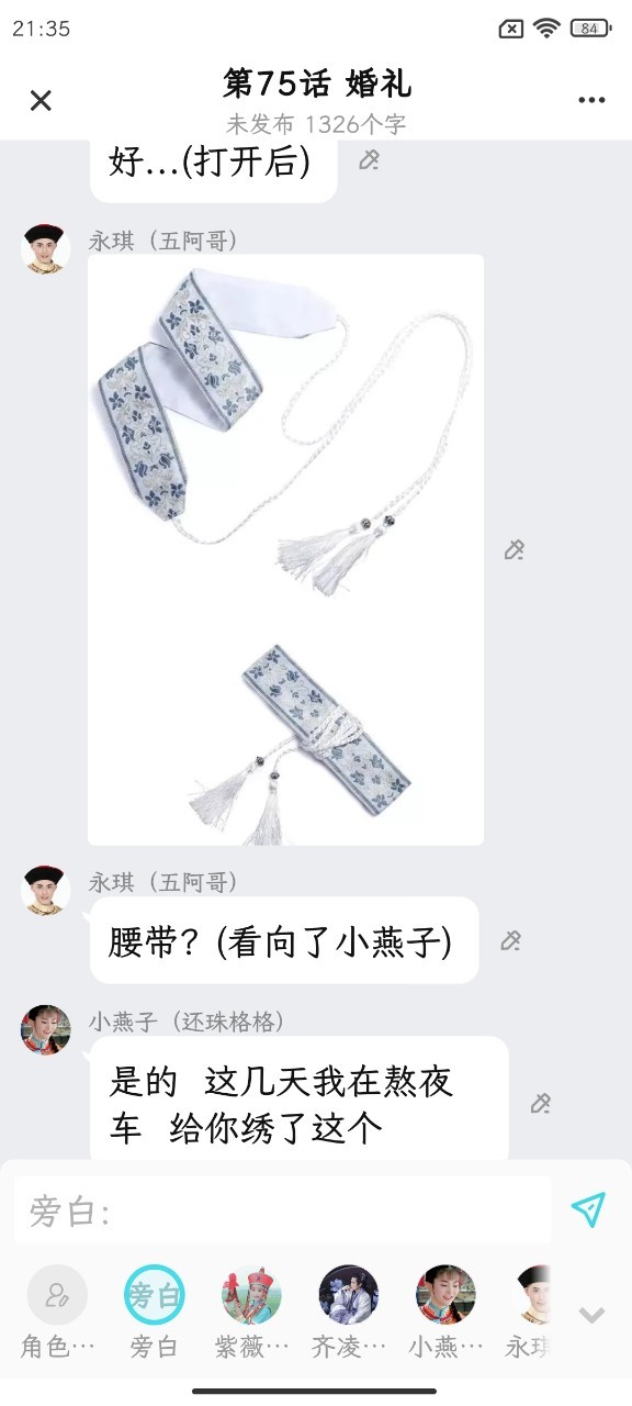 晴儿!晴格格是啊 我一针一线绣的 也不知道你喜不喜欢 反正我要牢牢的抓住你 (害羞的底下了头)