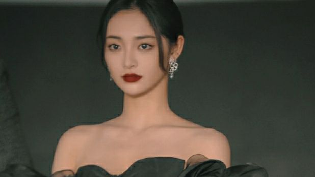 她的头发扎起,两侧只露出龙须刘海,十分稳重,耳朵上的白色长型耳饰也是干净整洁,红唇看去也显出一丝妩媚动人。