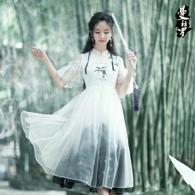 头发扎的是高马尾,用红丝带绑着的两边倒是留了和原著王默一样的两根辫子,裙子是一套汉元素的红衣白裙。