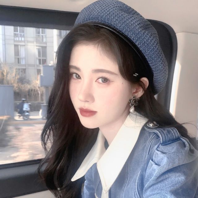 女孩戴了个贝雷帽,卷了头发眼睛画了点眼线和眼影,标准的m唇也画上了淡淡的粉色