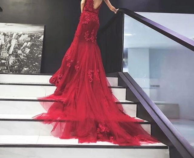 谈明身上穿上了晚礼服,艳红的颜色加上谈明现在白皙的皮肤显得格外美丽。