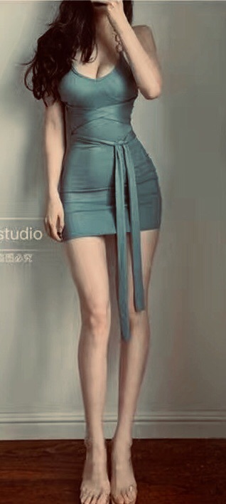 一件性感显身材的浅蓝色半透布料的连衣裙,这件衣服的肩膀处,用链条挂脖露出了褚晏美丽的肩膀和锁骨。,腰部的地方手收紧,两个袖子的手腕处采用喇叭袖的设计。