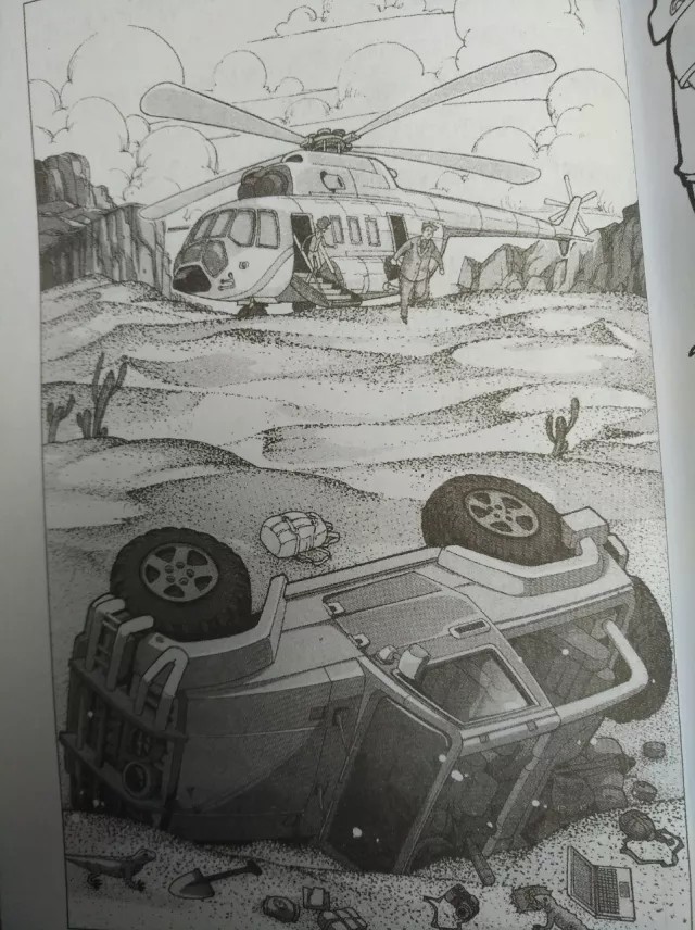 只见沙漠中,一辆敞篷越野车被掀翻了,车里的设备、食物和水散落一地,周围一片狼藉,车上并没有人。
