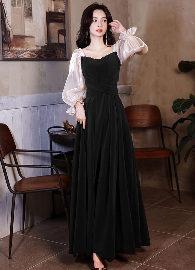 苏芊诺黑色的裙身刚好可以搭配的你黑色西装,而白色的那部分又可以做点缀,让这件礼服看起来不会过于沉闷,完美