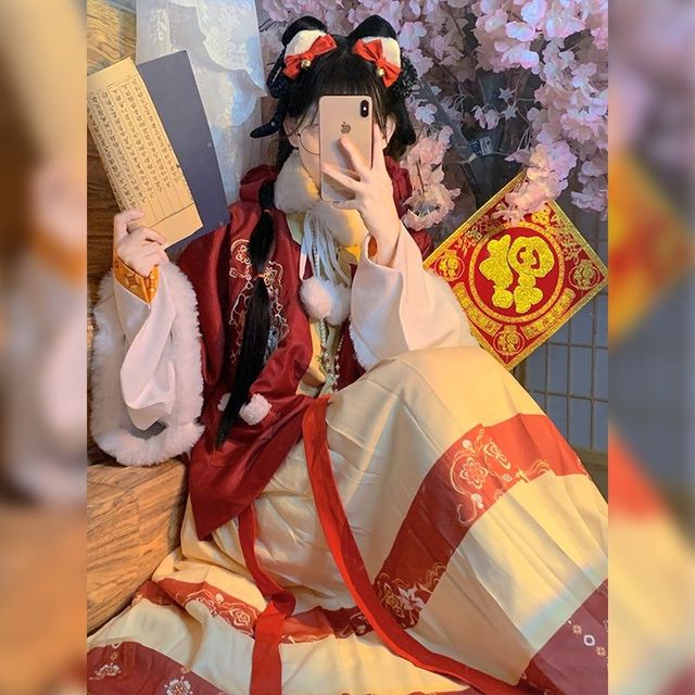 张真源在讲台上坐着,闻声向门外看去,只见一个面容姣好的女孩,一双杏仁眼,红扑扑的脸颊,明眸皓齿,身穿红色系汉服,黄色襦裙,头戴小铃铛