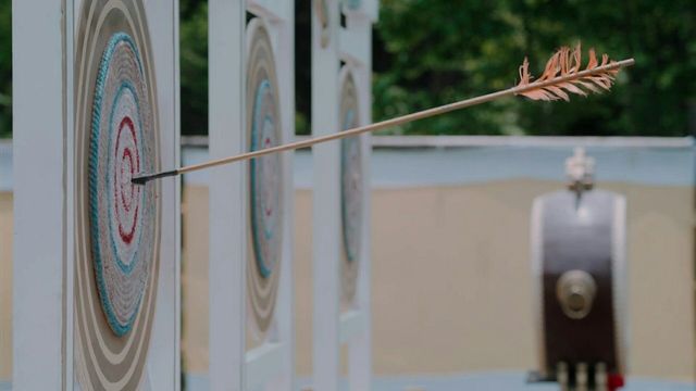 他接过金氏弟子递来的弓箭,飞身而起,一箭射中了靶心。