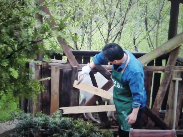 师父拿了一块儿板子准备钉羊圈