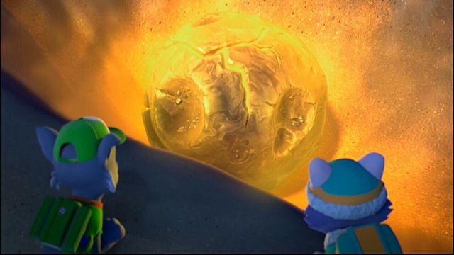在冒险湾的总部的夜晚,狗狗们正在睡觉,他们没有注意到一颗陨石正向冒险湾冲出去。!