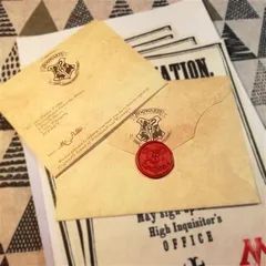信封是用厚重的羊皮纸做的,地址是用翡翠绿的墨水写的。没有贴邮票。信封上边有一块蜡封、一个盾牌纹章,大写“H”字母的周围圈着一头狮子、一只鹰、一只獾和一条蛇。