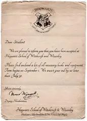 我们愉快地通知您,您已获准在霍格沃茨魔法学校就读。随信附上所需书籍及装备一览表。学期定于九月一日开始。我们将于七月三十一日前静候您的猫头鹰带来您的回信。
