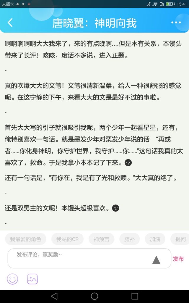 真的吹爆大大的文笔!文笔很清新温柔,给人一种很舒服的感觉呢。在这宁静的下午,来看大大的文是最好不过的事啦。