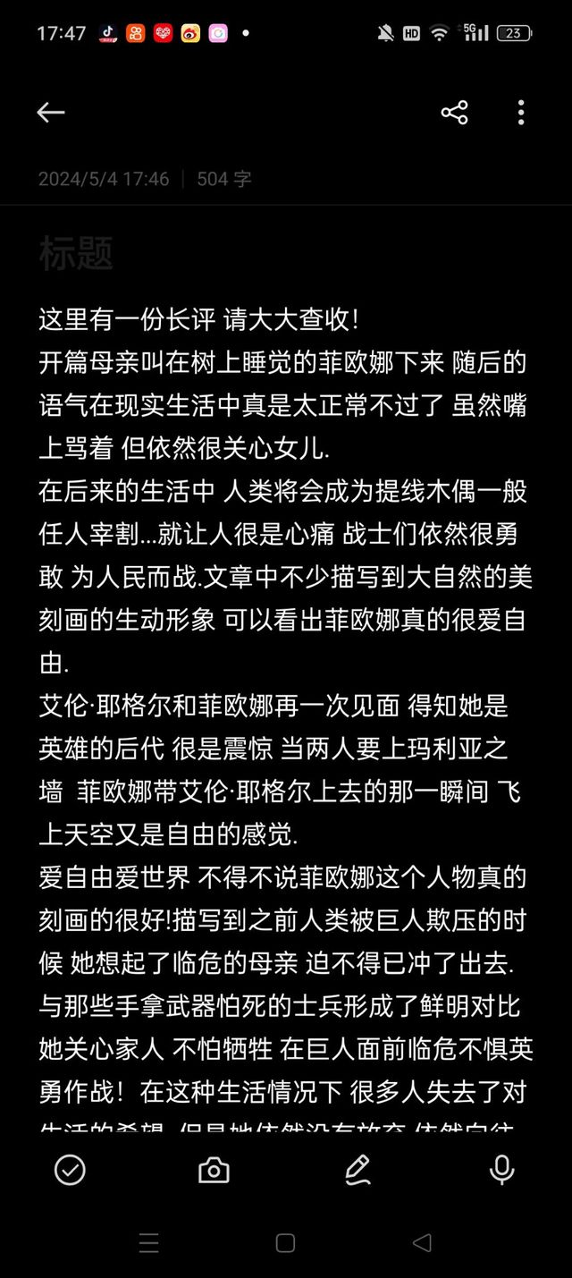 爱自由爱世界 不得不说菲欧娜这个人物真的刻画的很好!描写到之前人类被巨人欺压的时候 她想起了临危的母亲 迫不得已冲了出去.与那些手拿武器怕死的士兵形成了鲜明对比 她关心家人 不怕牺牲 在巨人面前临危不惧英勇作战!在这种生活情况下 很多人失去了对生活的希望 但是她依然没有放弃 依然向往着自由 享受着奔跑在田野上的感觉...