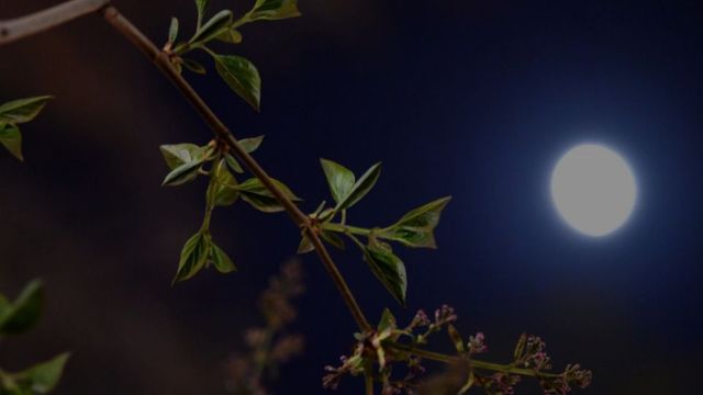 是夜,深蓝色铺满天空,上方闪烁着零零碎碎的星星,月亮高高挂起,洒落大地的月光如雾般光辉。