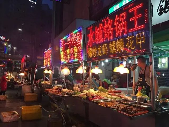 沿街摆满了各种东西,有糕点、有羊肉串,臭豆腐,炸串各种各样的小吃。摊主忙个不停地招揽着过往的行人。