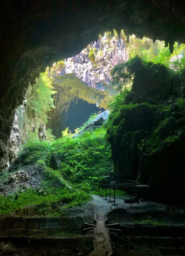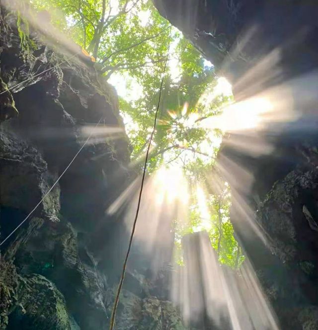 天洞顶部也是一个巨大的洞口,光线从天空中洒在面前的小湖上,能看到明显的光的形状,洞口边长满了密密麻麻的不知道是什么的植物,还有一些长长的藤蔓垂落下来,景色令人叹为观止。
