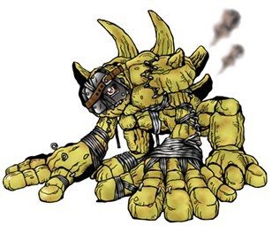 数码机(可可)魔像兽:数字解析超古代诅咒之时发现的岩石、矿物型数码兽。背后雕刻着“疫”“咒”“凶”和古代禁忌咒语,似乎是为了保护自己不受排放的气体影响。身体约九成由岩石数据构成,将手脚系住生存着。不被命令则不会动,是毫无感情的数码兽。