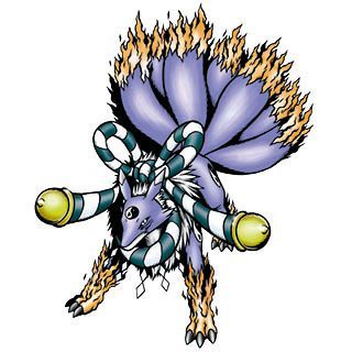 数码机(可可)妖狐兽:长有九条尾巴的巨大蓝狐模样的妖兽型数码兽。跟九尾兽不同,作为带来毁灭和崩溃的妖兽而被恐惧着。攻击力本身并不强,但拥有强大的精神力并擅长术系技能,据说以红色熊熊燃烧的四肢在天际驰骋。得意技是随心所欲操控出现的灼热火球“焰玉”。必杀技是让尾巴出现熊熊燃烧的赤炎之龙将敌人燃烧殆尽的“邪炎龙”。