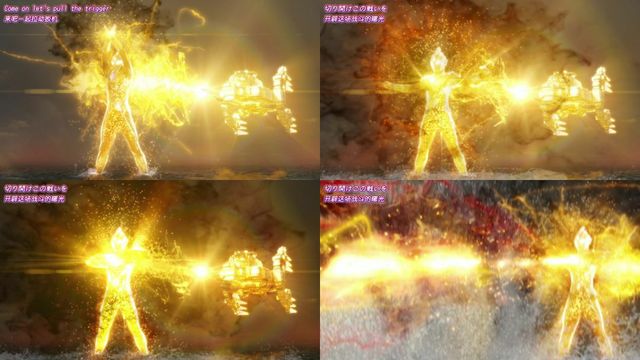 真理·特利迦{双臂分别出现闪耀着金红色光芒的能量型利爪与狼牙棒}真理永恒粉碎{顶着光线插向格利扎的胸口}