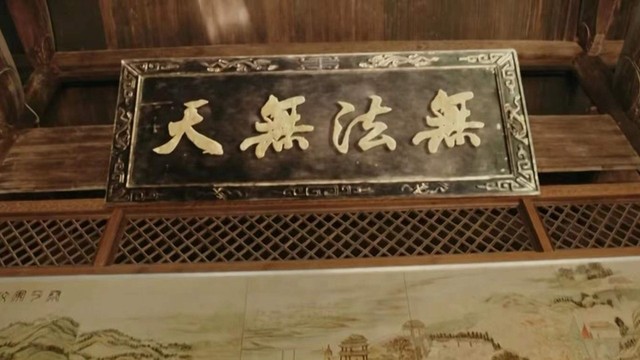 走过廊道穿过庭园便来到前厅,抬头迎面就见到一个赤金描边大匾,匾上写着斗大的四个字“无法无天”,我不禁讶然失笑,这吴家还真是明目张胆的狂妄,牌匾正下方并列摆放着两把福寿纹扶手椅,底下对称放着十张楠木交椅。