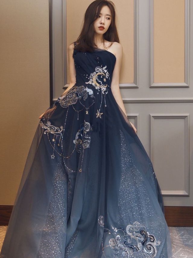 一系深蓝色的礼服,上面有纯手工绣的图案。搭配同色系的高跟鞋,头发披肩,洁白如玉的肌肤,化着淡妆。很是高雅。