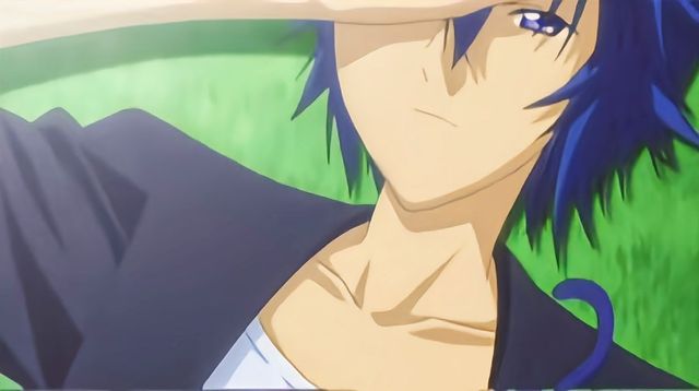 他微眯着冰眸,一头幽蓝的碎发在阳光下熠熠生辉,身着黑色制服,领口微微敞开,锁骨非常突出,衣服里面的肌肉若隐若现……