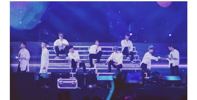 【镜头拉远,他们九个人从舞台后走出来,九人来到立麦前,灯光变成蓝色,屏幕变成巨大的门】