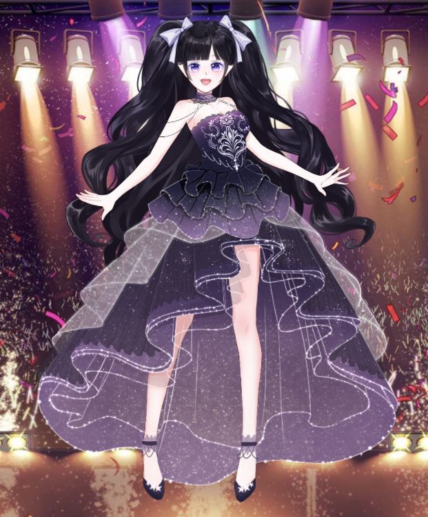 一个身着着黑紫色礼裙的少女,正站在灯光四射的舞台上,没错,那个少女就是身为偶像歌手的鲁鲁修。