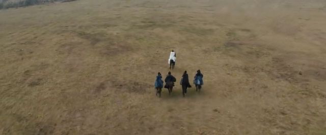 众人骑着战马飞驰在草地上。