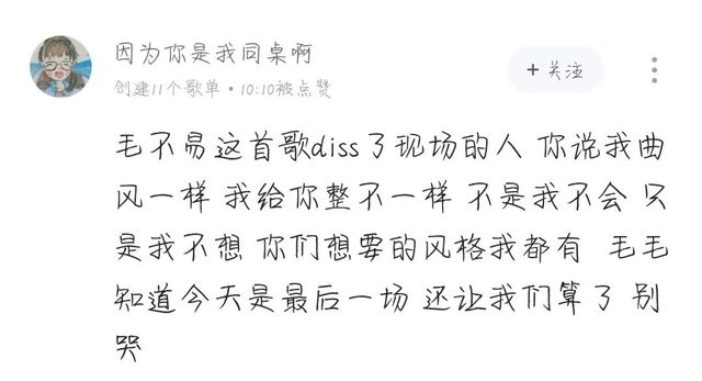 “毛不易这首歌diss了现场的人 你说我曲风一样 我给你整不一样 不是我不会 只是我不想 你们想要的风格我都有 毛毛知道今天是最后一场 还让我们算了 别哭.”