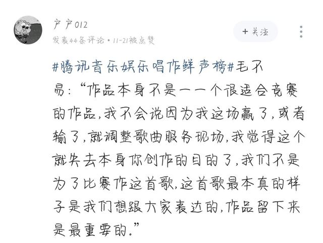 “#腾讯音乐娱乐唱作鲜声榜#毛不易:“作品本身不是一一个很适合竞赛的作品,我不会说因为我这场赢了,或者输了,就调整歌曲服务现场,我觉得这个就失去本身你创作的目的了,我们不是为了比赛作这首歌,这首歌最本真的样子是我们想跟大家表达的,作品留下来是最重要的。”