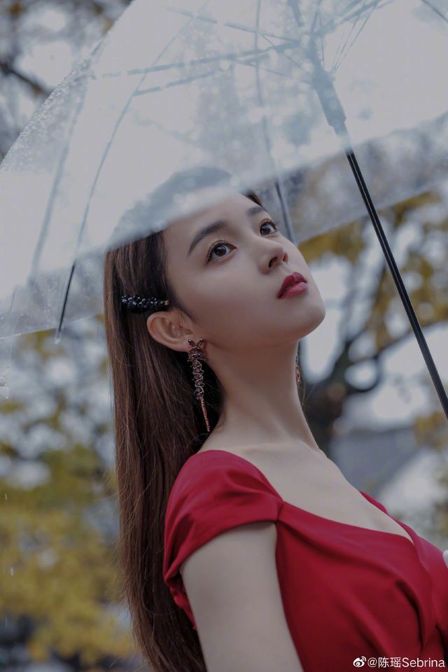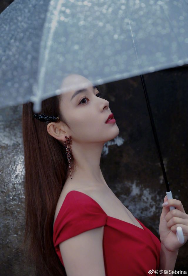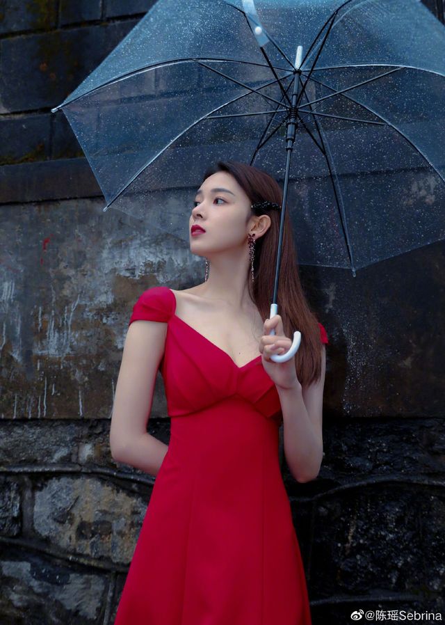 摄影师吴哥提醒工作人员拿把伞递给西门苑,她撑着伞,一只手背在后面,一脸忧郁地看向远方,换着各种各样的姿势。