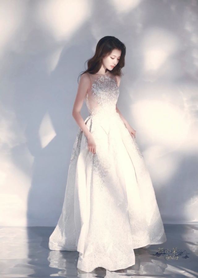 银色的蕾丝刺绣礼服,露出纤细修长的手臂,微卷的长发披在肩上