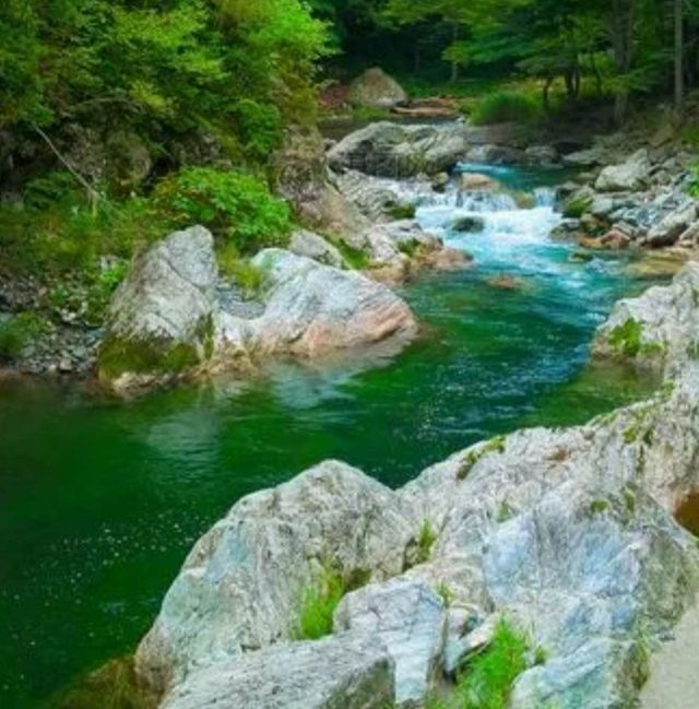 溪水顺着弯弯曲曲的山谷流下来,时而急,时而缓,当溪水从高坡上流下来时,飞溅起团团水雾,溪水清澈透明,可以清楚地看见小溪底的沙石。